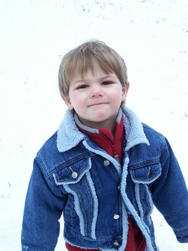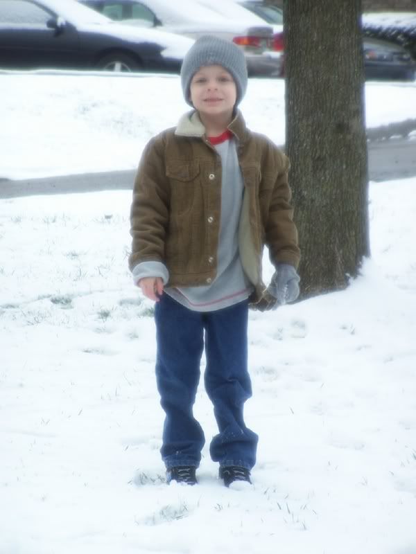 Aidan enjoying the snow (he took his hat off). He spent a good 2 or 3 minutes walking around a tree making footprints which he later viewed from the upstairs window and thought were pretty neat.